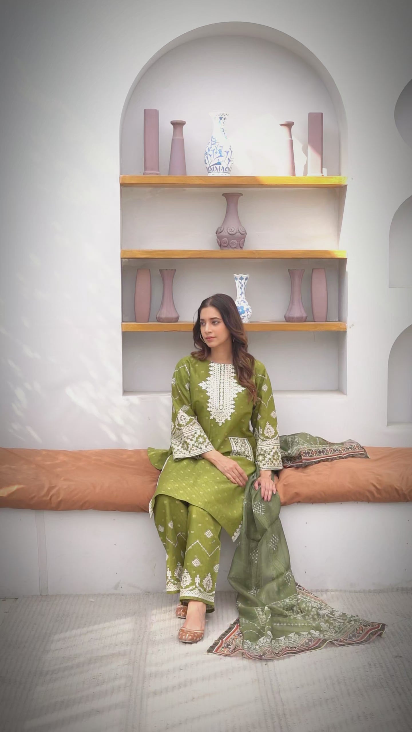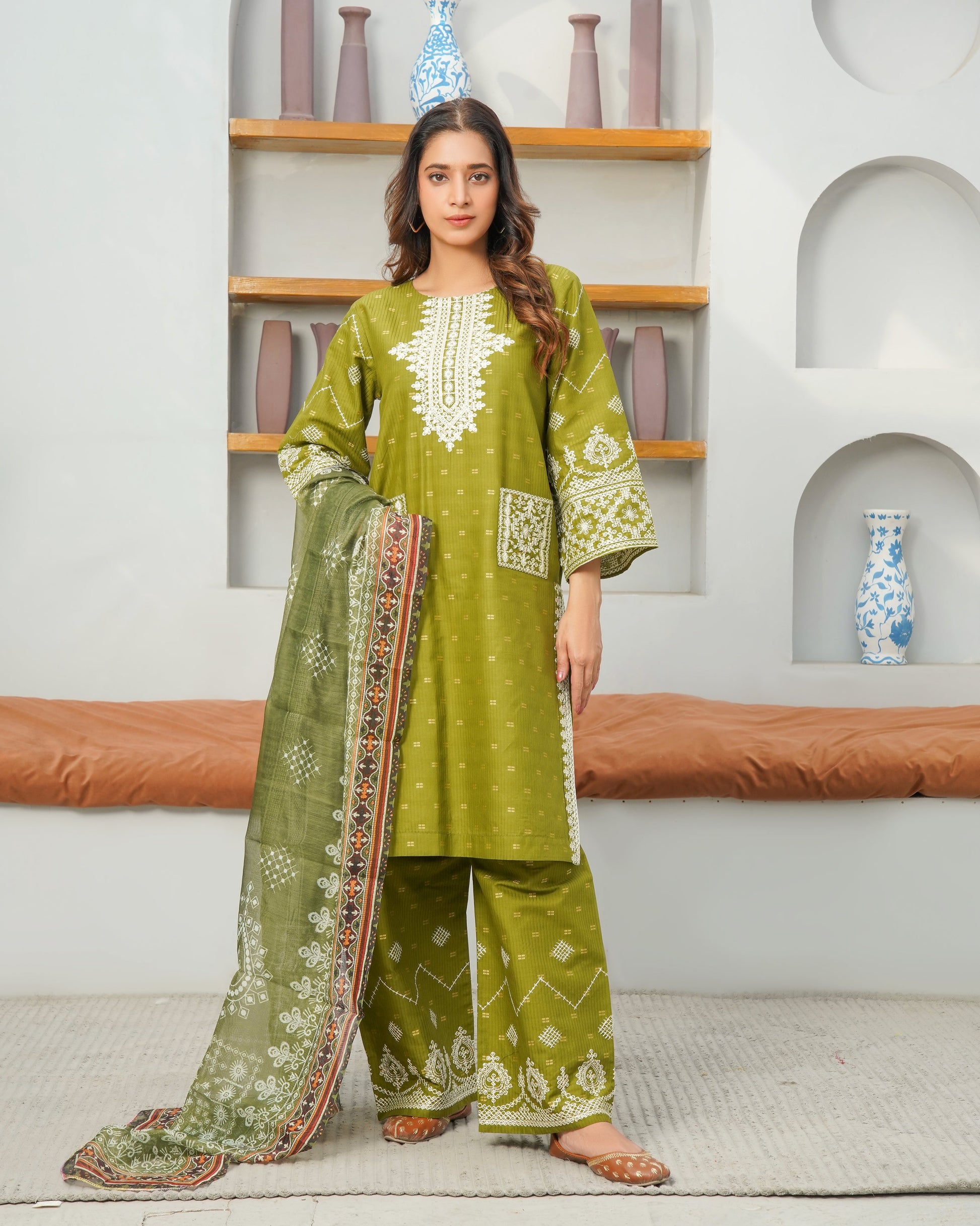 A refreshing blend of tradition and style — this olive green 3-piece suit is designed with delicate white embroidery that adds elegance to the entire outfit. The embroidered neckline, sleeves, and pocket detail enhance the charm of this look. Paired with a matching printed trouser and a soft printed dupatta, this ensemble is a perfect pick for casual wear or semi-formal gatherings.