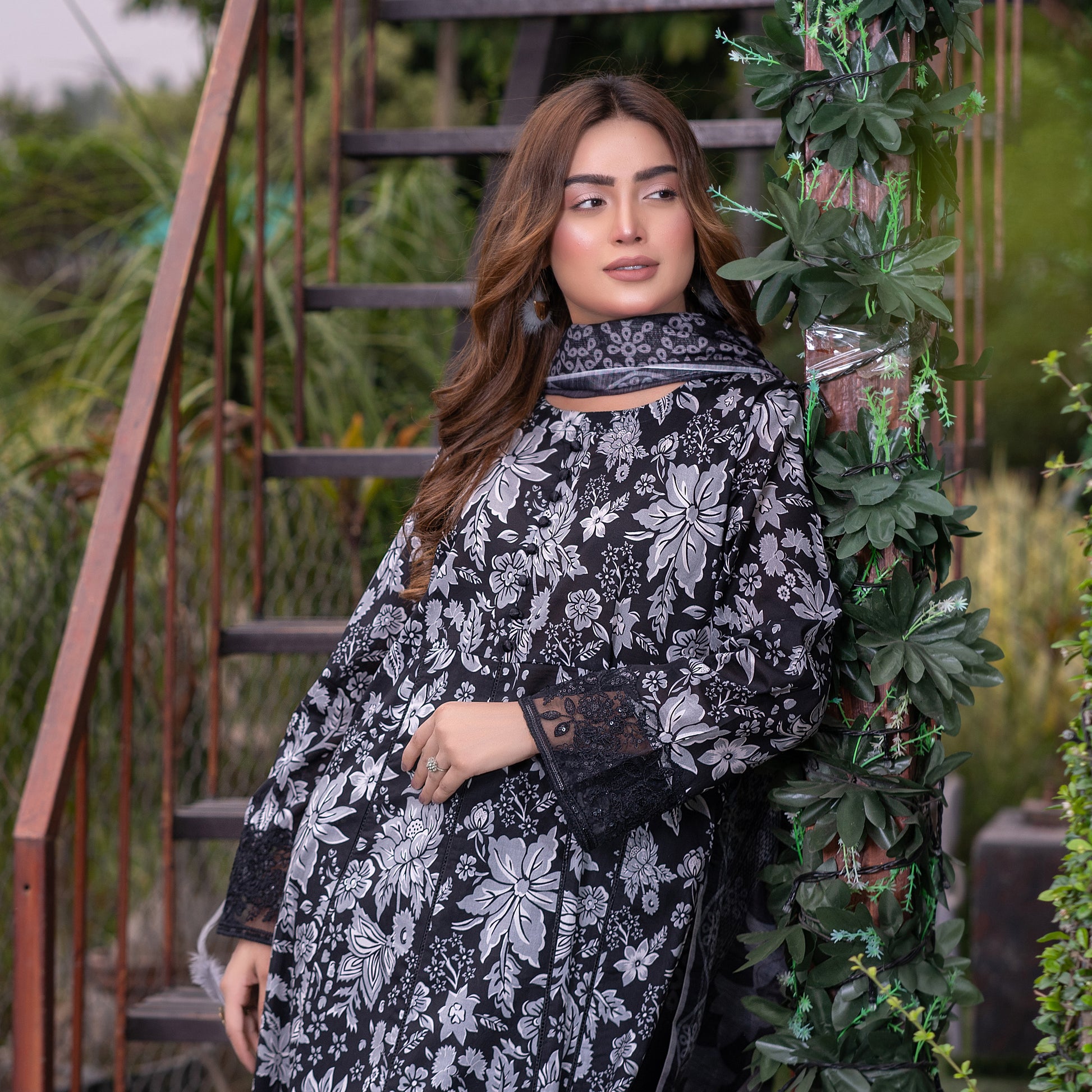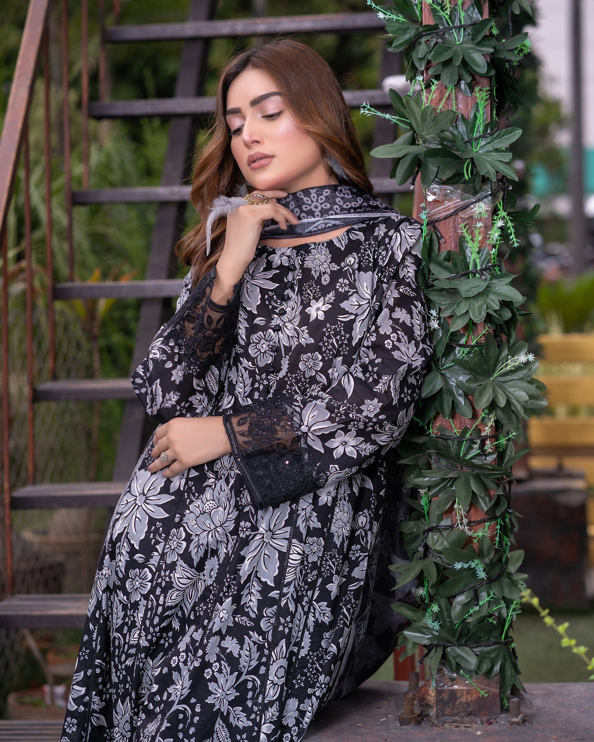 A timeless blend of tradition and sophistication, this black printed frock-style lawn suit is a perfect addition to your summer wardrobe. Designed with intricate detailing and graceful flair, it brings effortless elegance to your look.