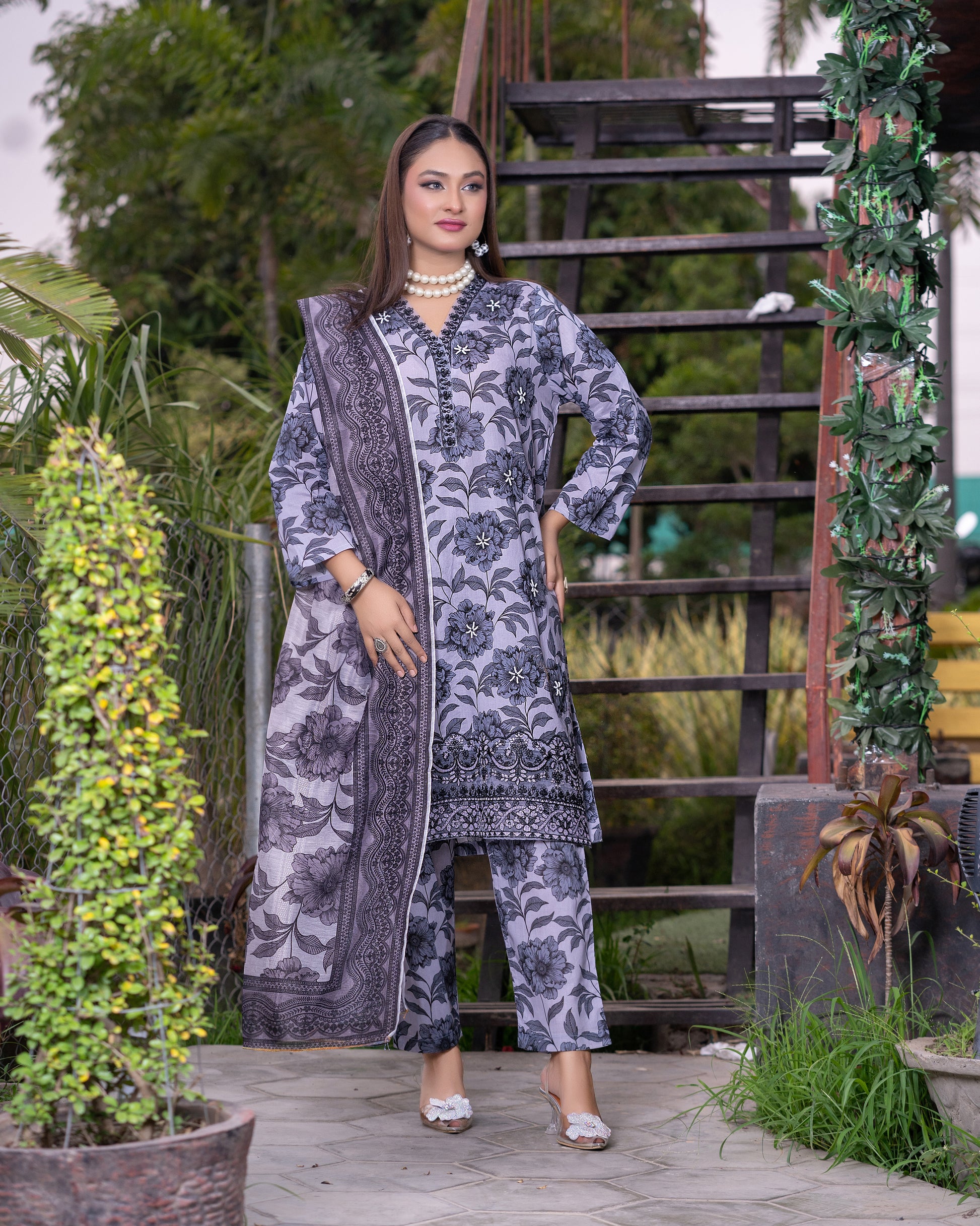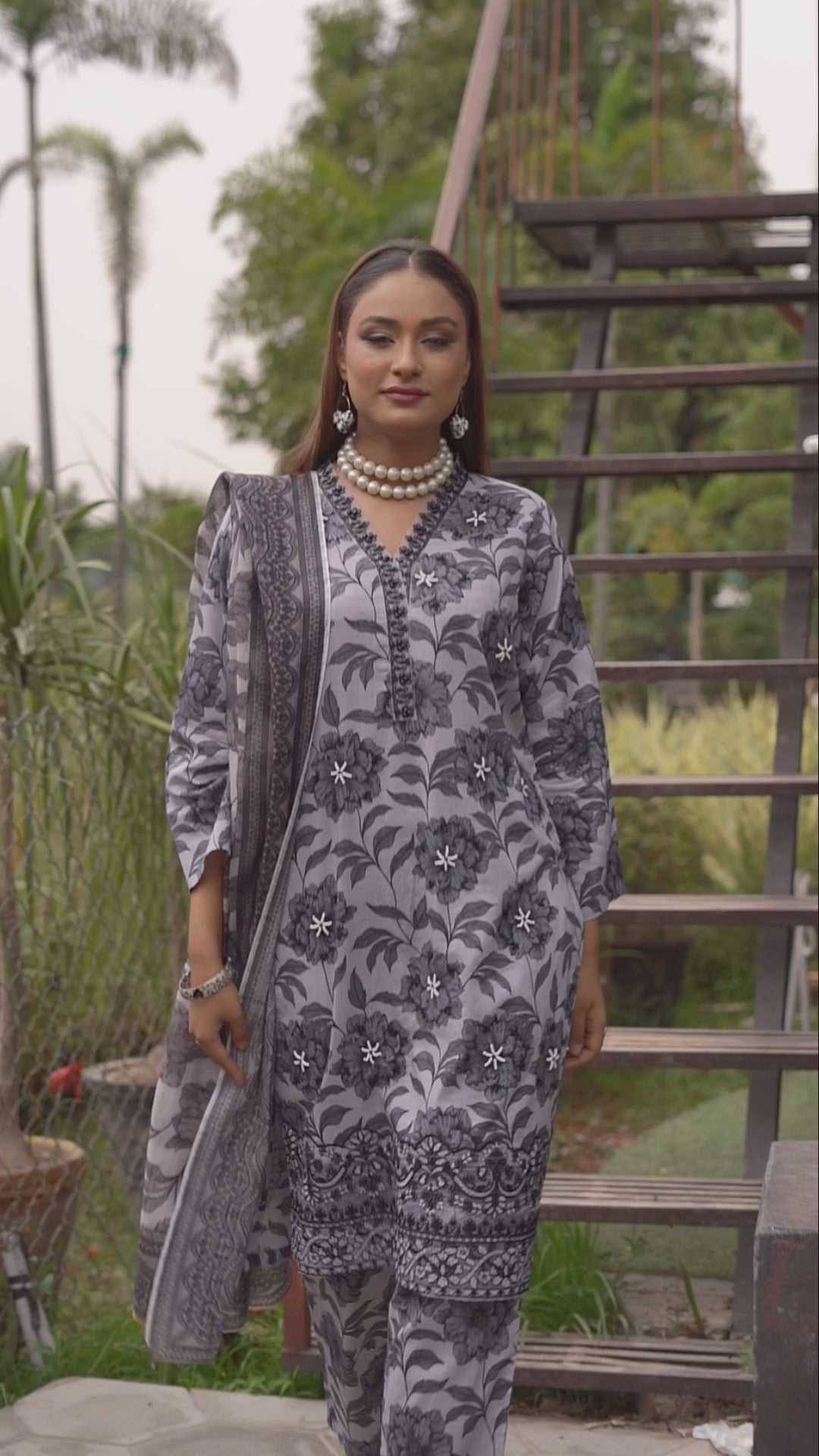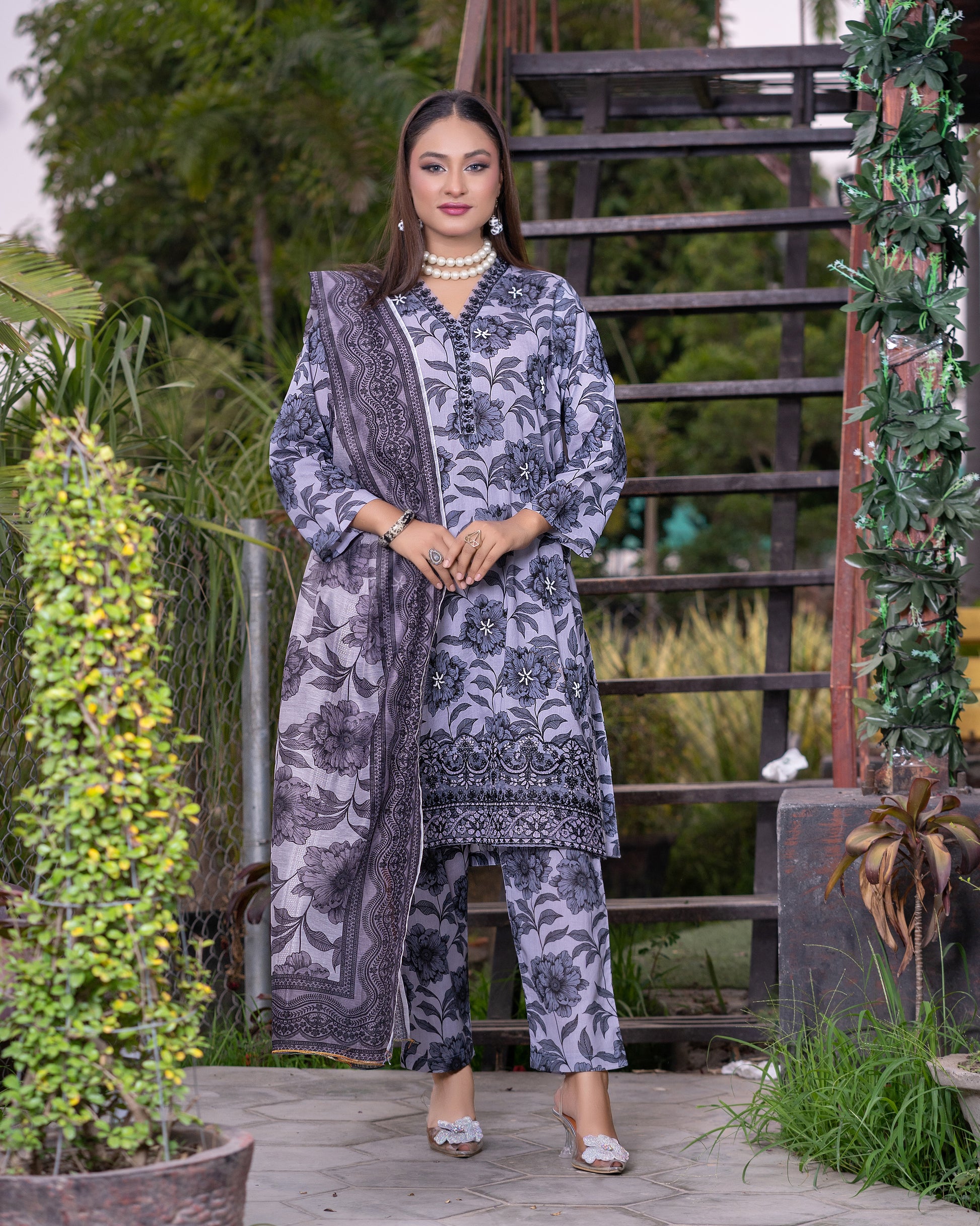 Make a bold and elegant statement with Charcoal Bloom — a stunning 3-piece stitched lawn suit in a deep monochrome palette. This sophisticated design features a grey base adorned with intricate floral motifs in charcoal black, giving it a graceful yet commanding presence.