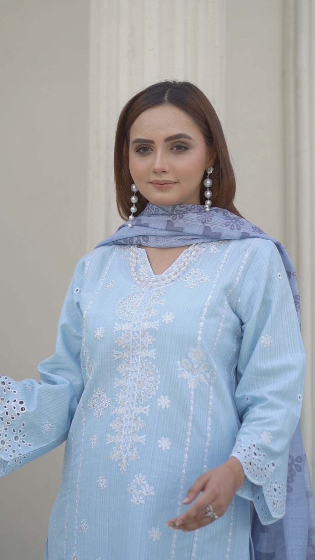 An embodiment of elegance and freshness, Bluebell Serenity features a soft pastel blue canvas adorned with intricate white chicken kari embroidery. The classic silhouette is elevated with beautifully embroidered tissue patches on the shirt border, while the sleeves showcase delicate eyelet cutwork for a graceful finish. Paired with a printed digital lawn dupatta and a matching trouser, this design is perfect for summer sophistication.