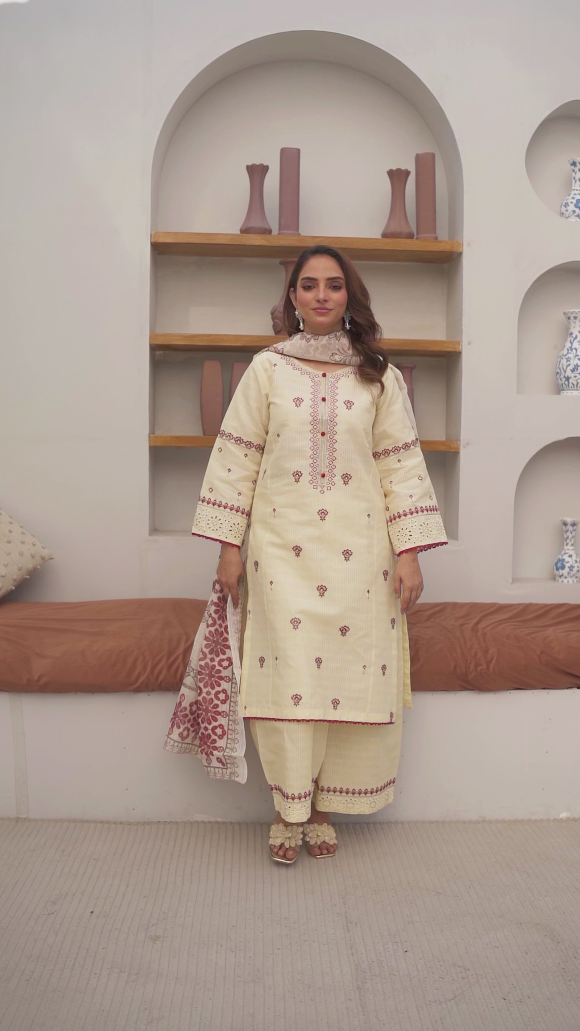 Celebrate the freshness of spring with Spring Serenade — a classic cream 3-piece stitched suit featuring delicate chickenkari embroidery, rust-toned accents, and a vibrant floral printed dupatta. The fusion of subtle textures and bold prints makes this ensemble ideal for daytime gatherings, casual brunches, or festive get-togethers.