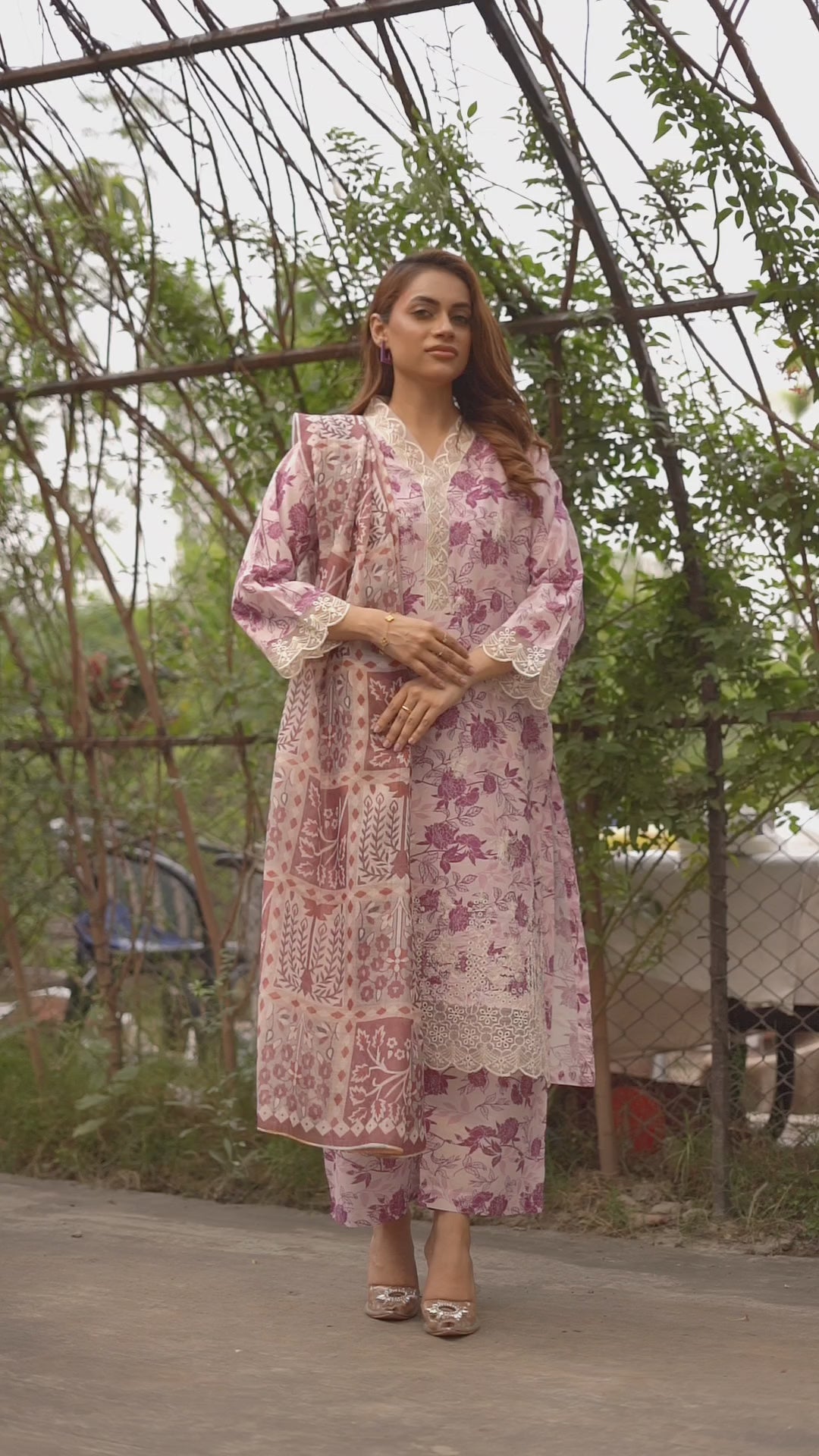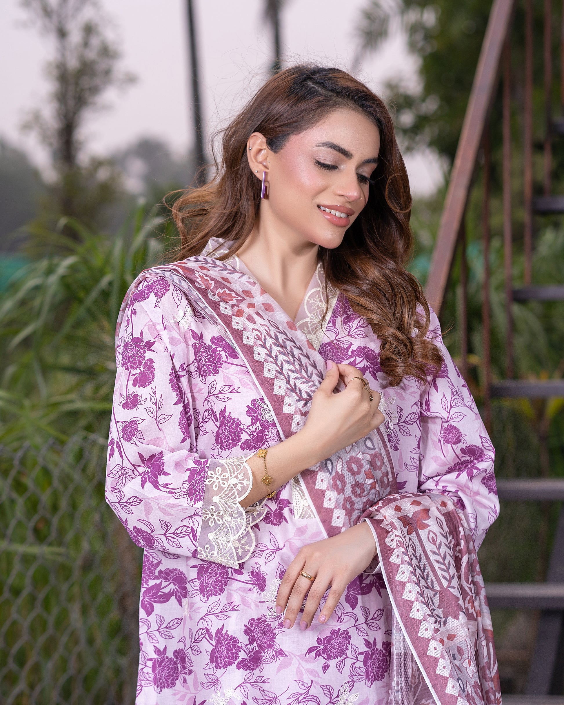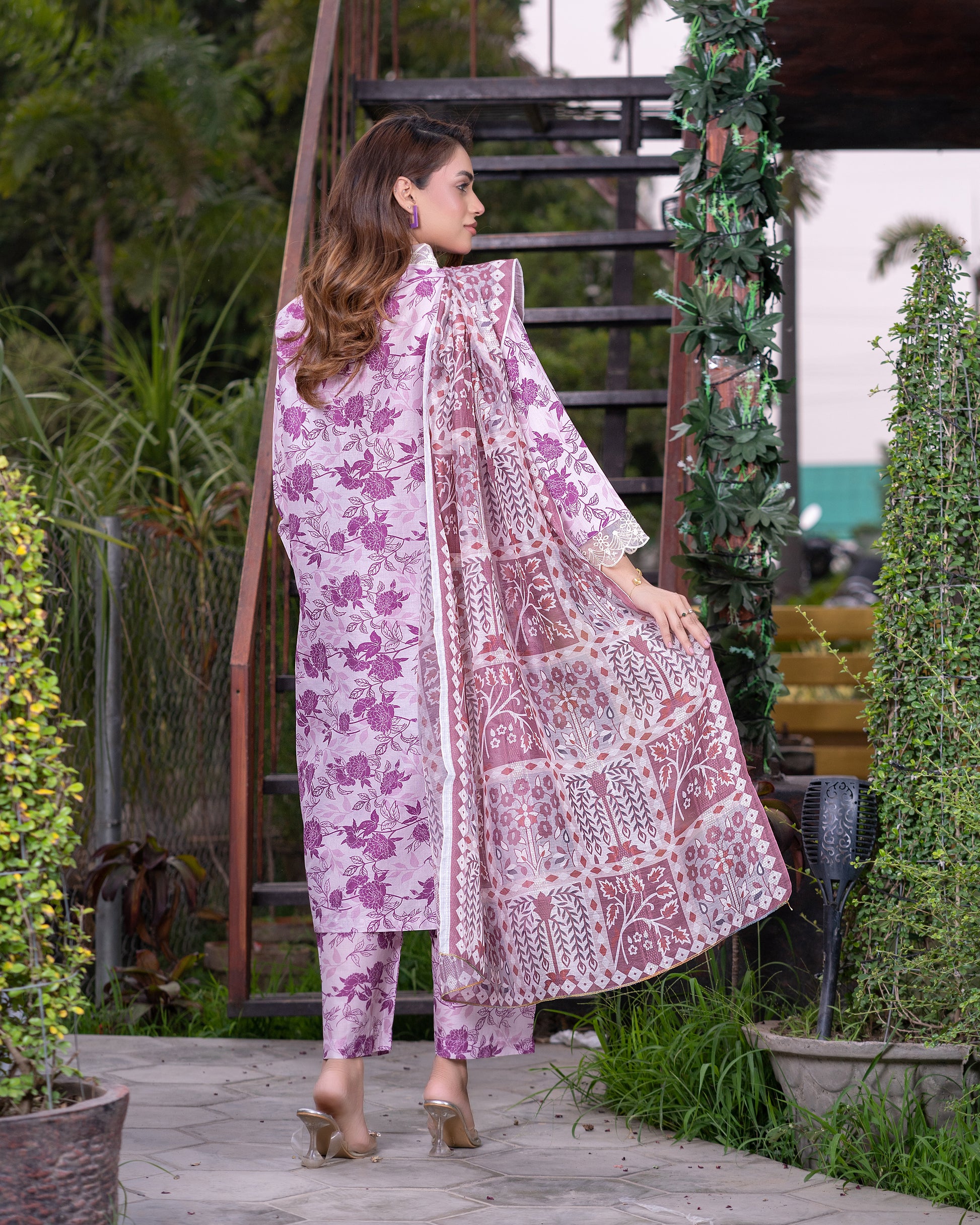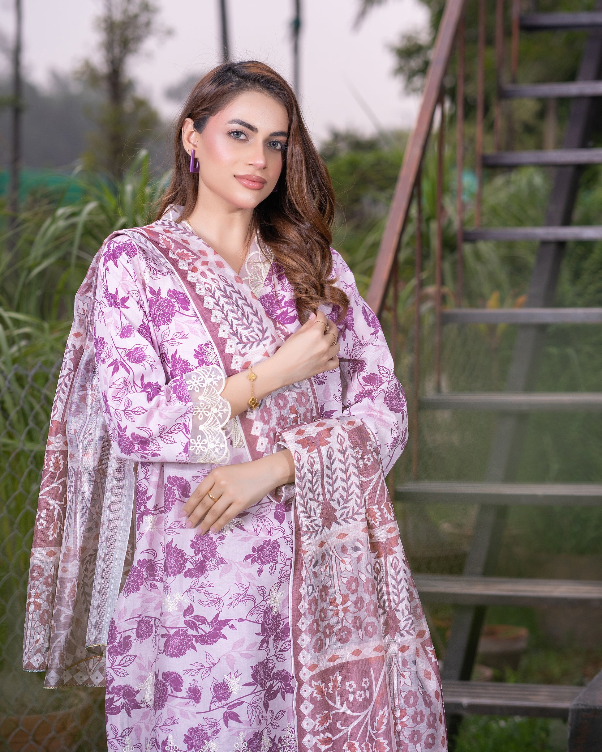Elevate your wardrobe with Lilac Grace – a beautifully crafted 3-piece printed lawn suit that blends elegance with refined detailing. The shirt features delicate embroidery on a soft tissue base, with lace work gracefully adorning the neckline, sleeves, and trouser borders. Intricate patchwork enhances the overall sophistication of the ensemble.