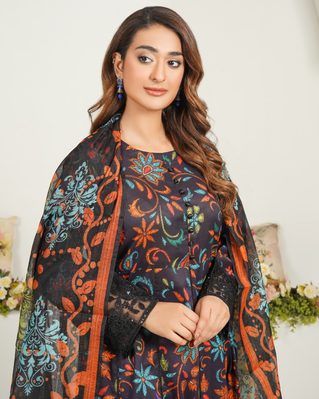 Unveil your vibrant side with our Midnight Garden Suit. This stunning ensemble features a rich black base adorned with lively multicolor floral and paisley patterns that create a striking statement. The intricate designs are beautifully complemented by a delicately embroidered dupatta and lace-detailed sleeves and hem, adding a touch of luxury to the outfit. Crafted from comfortable, breathable fabric, this suit is perfect for festive events, family gatherings, or adding flair to your everyday style.