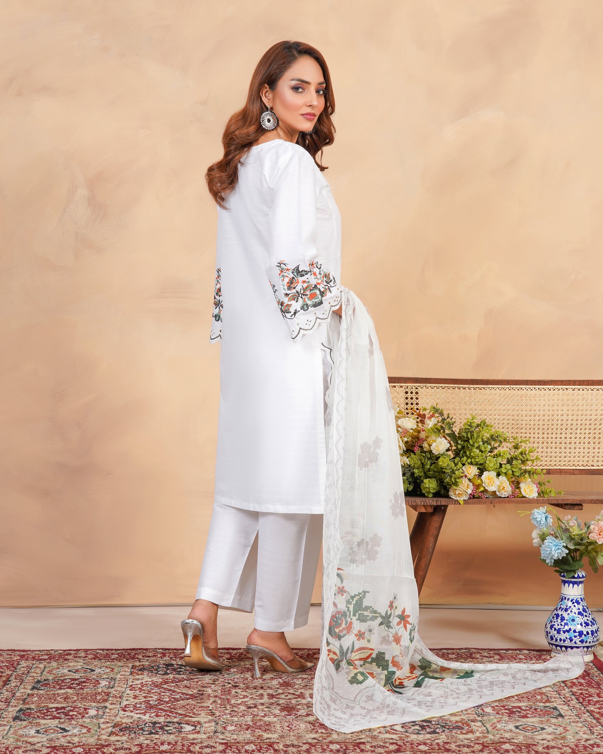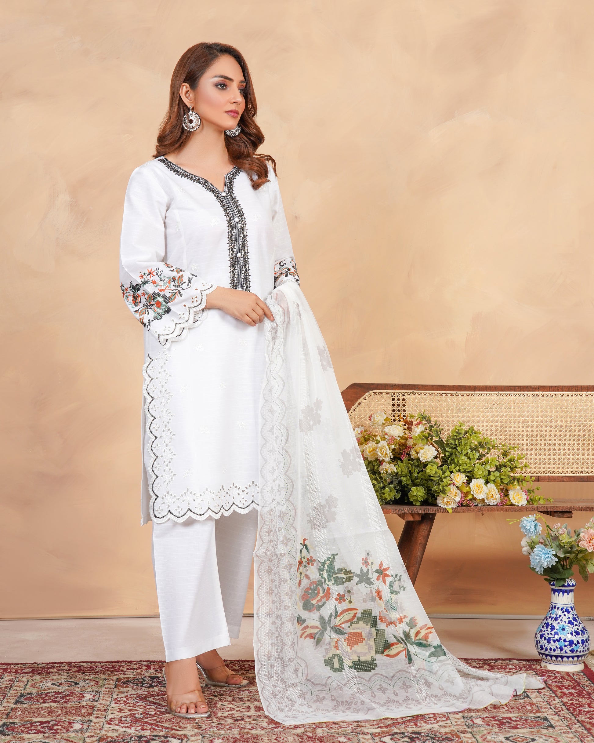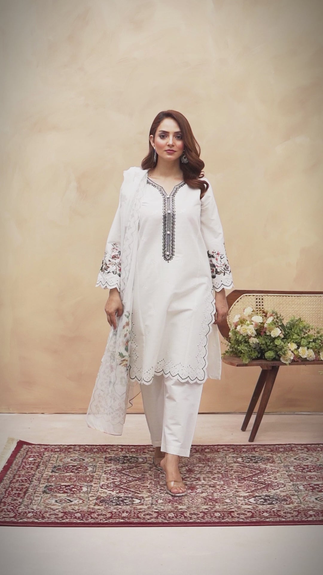 Step into elegance with Ivory Charm, a stunning white 3-piece stitched ensemble that exudes grace and purity. Crafted from soft cotton fabric, the shirt features intricate thread embroidery on the sleeves paired with a beautifully detailed black handworked neckline, adding a sharp contrast. The hemline and sleeves are finished with delicate laser-cut scalloped edges, giving the suit a refined and modern touch. The look is completed with a soft, embroidered organza dupatta and matching trousers β perfect for summer evenings, Eid, or intimate celebrations.