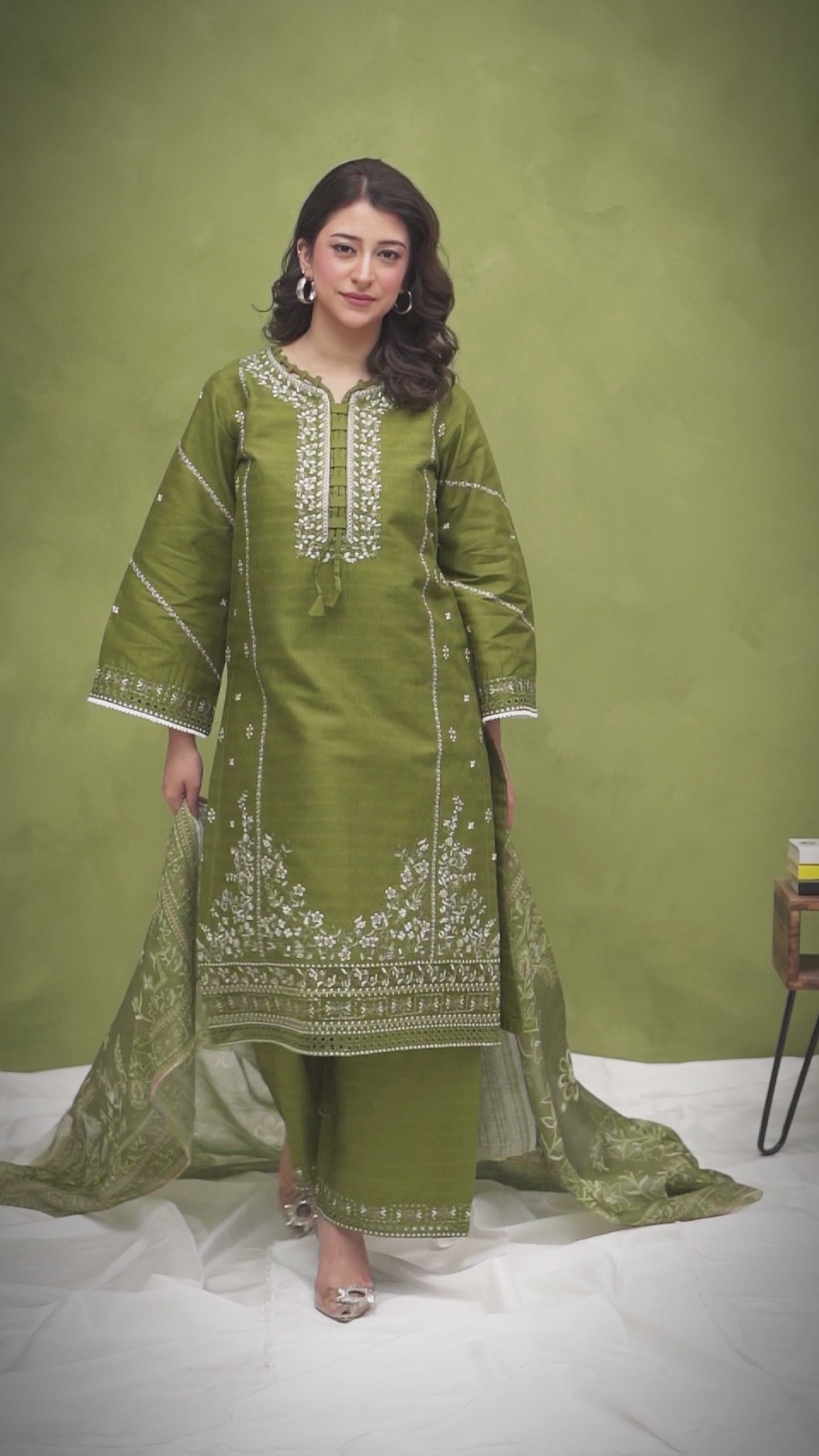 A classic blend of elegance and traditionāthis olive green 3-piece stitched suit from Fatima Official is designed for women who love subtle luxury. Made from self-textured premium fabric, featuring intricate embroidery, paired with a matching embroidered trouser and a beautifully printed dupattaāa timeless addition to your wardrobe.