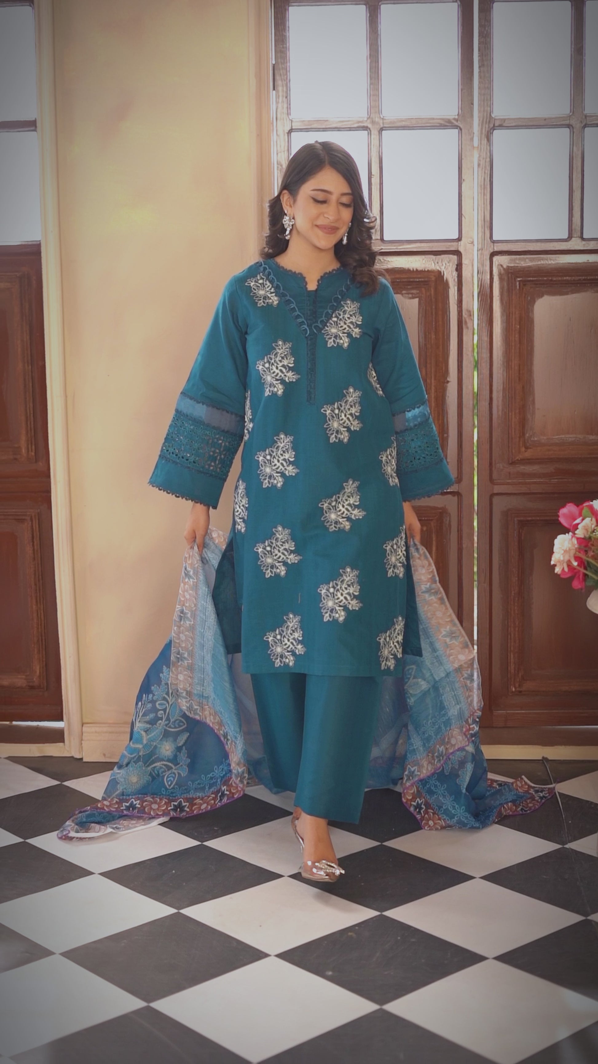 Elevate your ethnic style with this stunning Peacock Blue 3-piece stitched suit from Fatima Official. Beautifully crafted on premium fabric with white intricate embroidery and a printed dupatta β this outfit is a perfect blend of elegance and tradition.