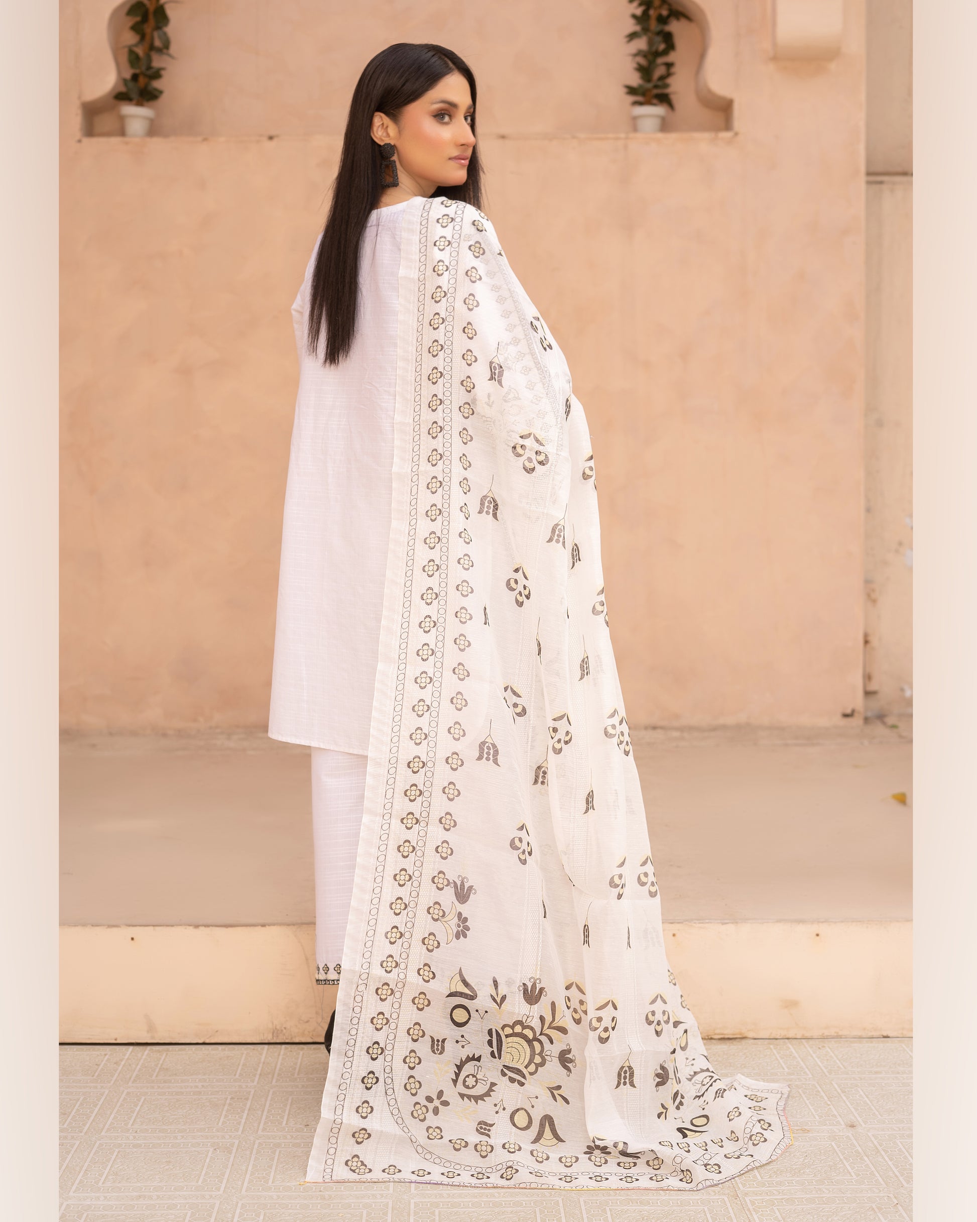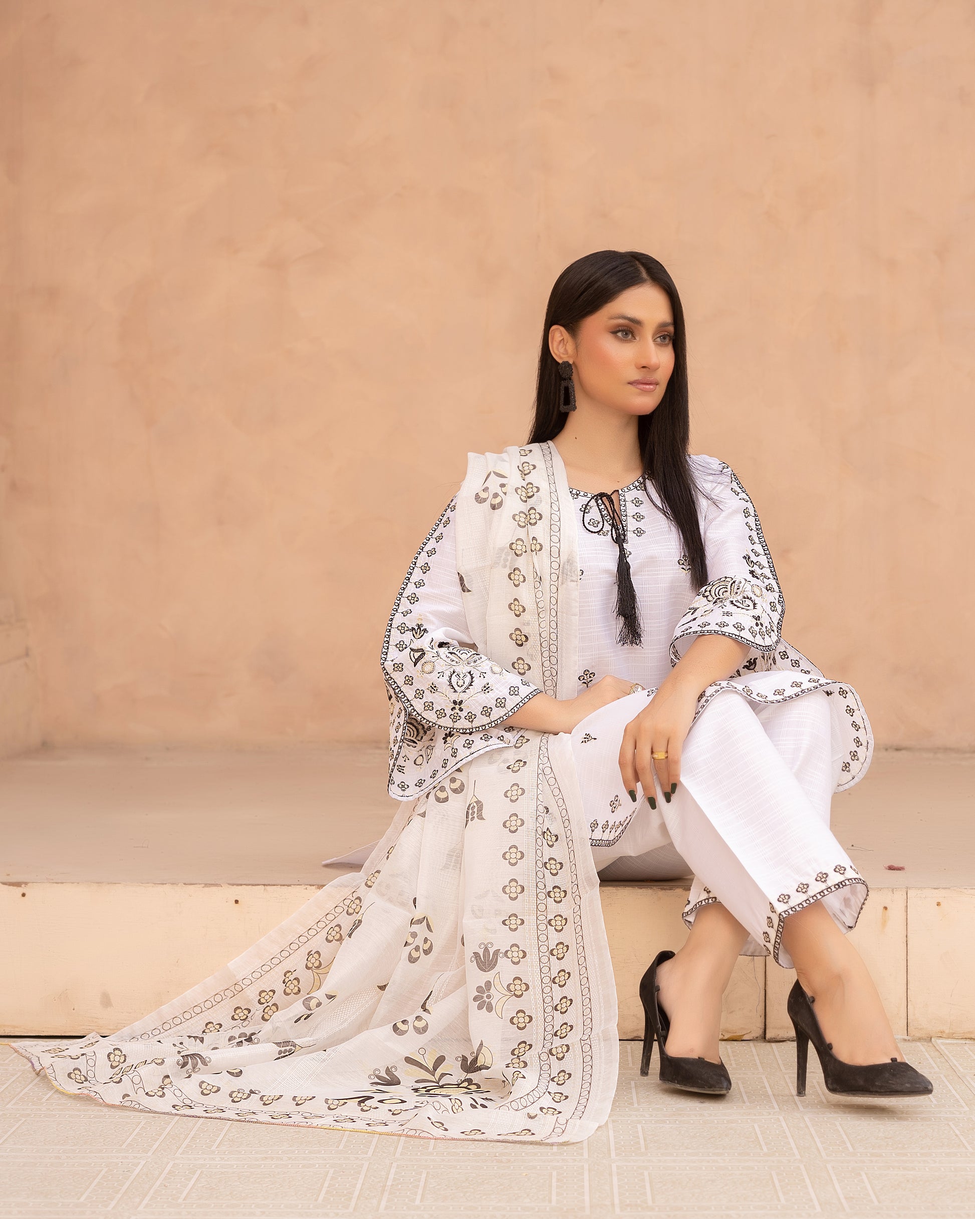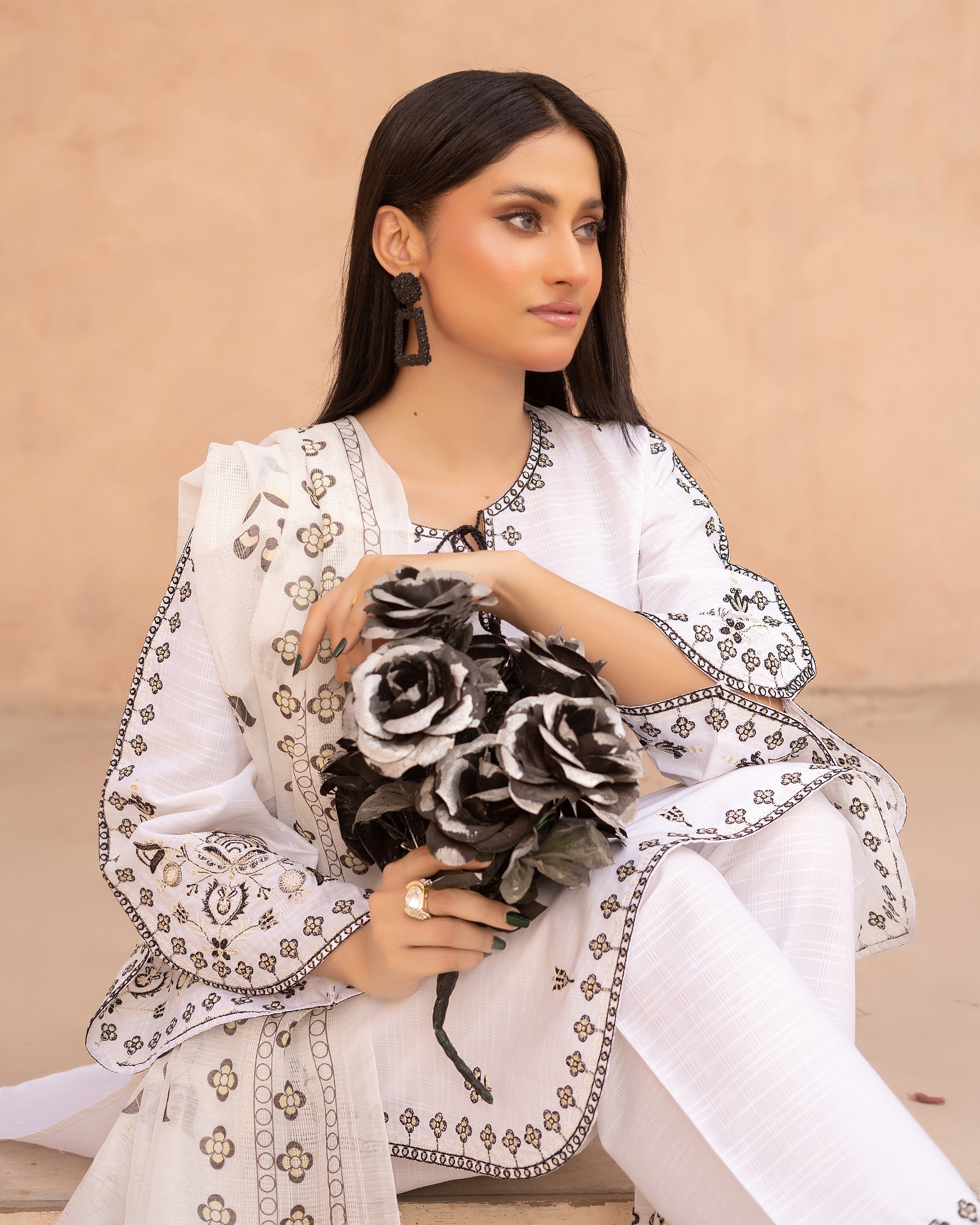 Radiate pure elegance with White Blossom — a sophisticated 3-piece stitched suit in a refreshing white shade, adorned with intricate black embroidery. Crafted on premium self-textured cotton, this ensemble is a timeless classic perfect for formal gatherings, daytime events, and festive occasions. The beautifully embroidered sleeves, neckline tassel detail, and coordinated dupatta add a graceful charm to your overall look.